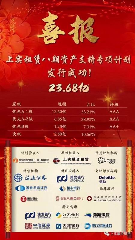 由上實(shí)融資租賃有限公司發(fā)行的“上實(shí)租賃八期資產(chǎn)支持專項(xiàng)計(jì)劃”于2019年7月17日成功設(shè)立,發(fā)行規(guī)模23.68億。牽頭銷售機(jī)構(gòu)海通證券、國(guó)君證券,聯(lián)席銷售機(jī)構(gòu)國(guó)融證券,項(xiàng)目安排人浦發(fā)銀行、恒豐銀行、東亞銀行。截至目前,上實(shí)租賃已發(fā)行八期ABS產(chǎn)品,總計(jì)發(fā)行金額為146.93億元。通過(guò)多次發(fā)行逐步建立了一套以“專業(yè)化的風(fēng)控流程”為核心、“標(biāo)準(zhǔn)化的承做流程”和“職業(yè)化的管理流程”為兩翼的資產(chǎn)證券化發(fā)行體系。