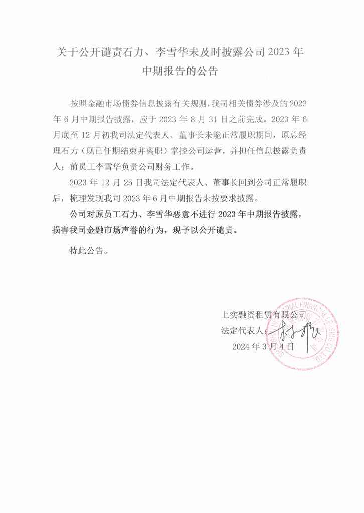 | 當(dāng)前位置:新聞中心 > 關(guān)于公開譴責(zé)石力、李雪華未及時披露公司2023年中期報告的公告 | |||||